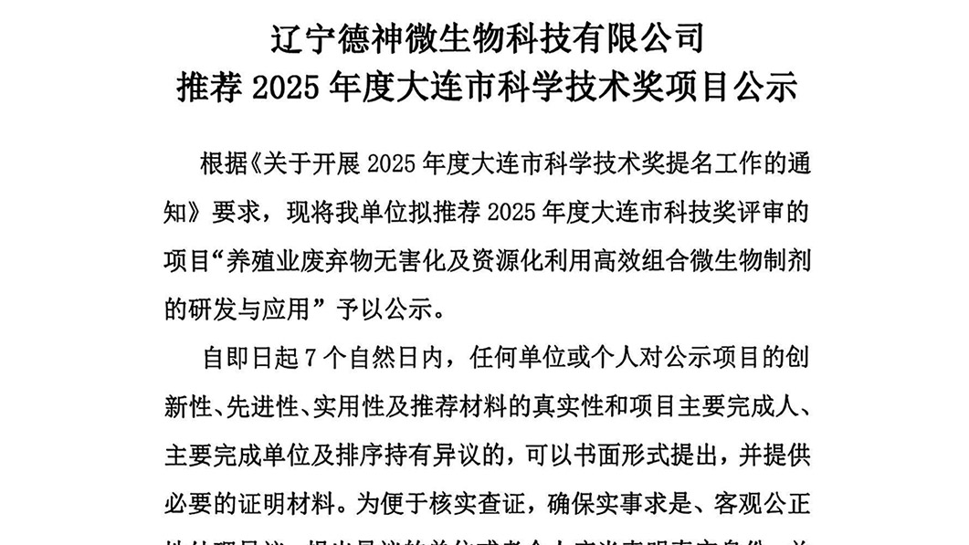 遼寧德神微生物科技有限公司推薦 2025年度大連市科學(xué)技術(shù)獎(jiǎng)項(xiàng)目公示